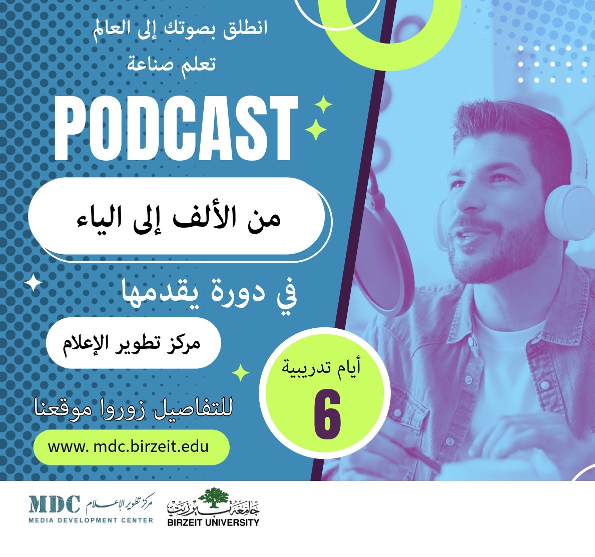 انضم إلى هذه الدورة التدريبية المتكاملة التي يعقدها مركز تطوير الإعلام في جامعة بيرزيت لتتعلم كل ما تحتاجه لامتلاك قناة بودكاست احترافية على أشهر المنصات العالمية، تُعبّر من خلالها عن أفكارك وتجاربك بأعلى درجات الإتقان والتأثير.